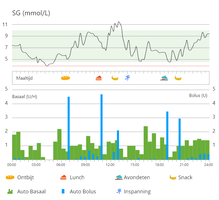 Wanneer je sensorglucose in een stijgende trend zit, zal de Auto Modus meer insuline toedienen. Dit om hypers te voorkomen.